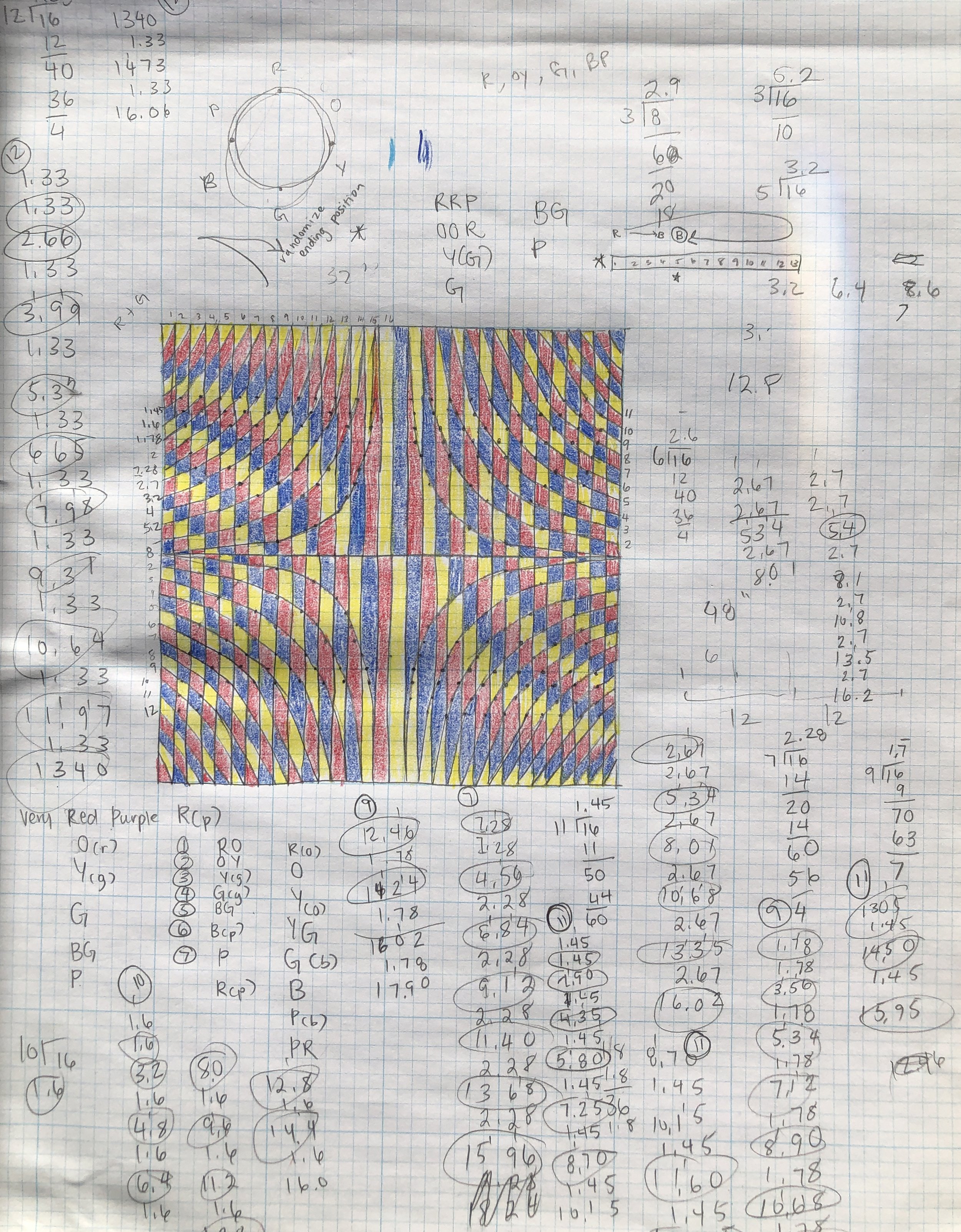 Her work inhabits a world between two Agneses; the disciplined and meditative, process based paintings of Agnes Martin and the ethereal, transcendental themes of Agnes Pelton. By abiding by such systems in her work, Bass asks: what arises from layering numerical and visual code on top of one another? What becomes rendered as patterns are repeated? She says that when she works in this way, she is just illustrating something that already exists. She doesn’t need to convince anyone of the magical, spiritual, ethereal knowledge she possesses and feels- because the foundation of this truth in mathematics is irrefutable. Thanks to the accepted systems of math, she is able to use color to illustrate the expansion of divisions and unfurl into realms of uncertainty and relativity. Music, sound ways, light particles, magnetic fields, these are examples of accepted truth.