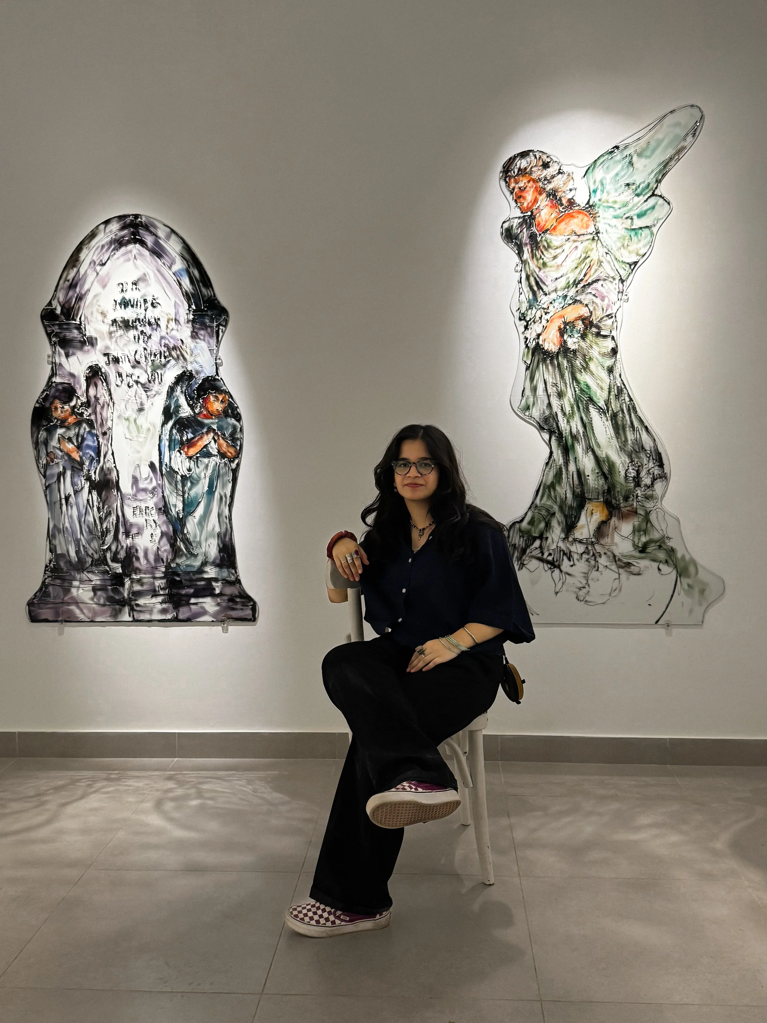 Her art takes root in overlooked spaces - graveyards, neglected religious sites, fragile urban traces, where memory and grief intersect with acts of erasure. Starting with the intimacy of her sketchbook, Mazhar’s practice evolves into larger canvases, assemblages and projection-based installations that weave together brushwork, found objects, sound and moving image. With a growing exhibition record that includes the COMO Museum of Art, Canvas Gallery, Zahoor ul Akhlaq Gallery and Vasl Artists’ Association, as well as collaborations supported by the British Council and Glasgow Museums, she is steadily gaining recognition within Pakistan’s contemporary art scene and beyond.